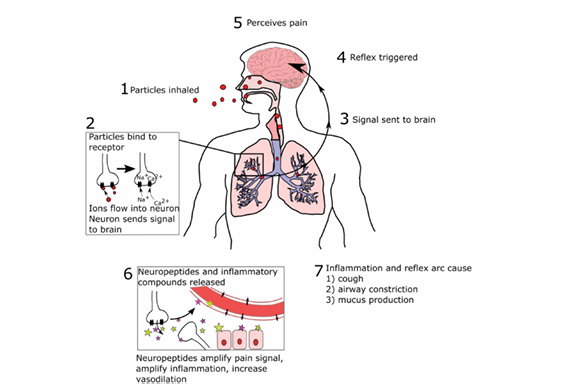 - Pertama, partikel kimia terhirup ke paru-paru sehingga mengaktifkan reseptor yang berlokasi di serabut saraf nociceptive.